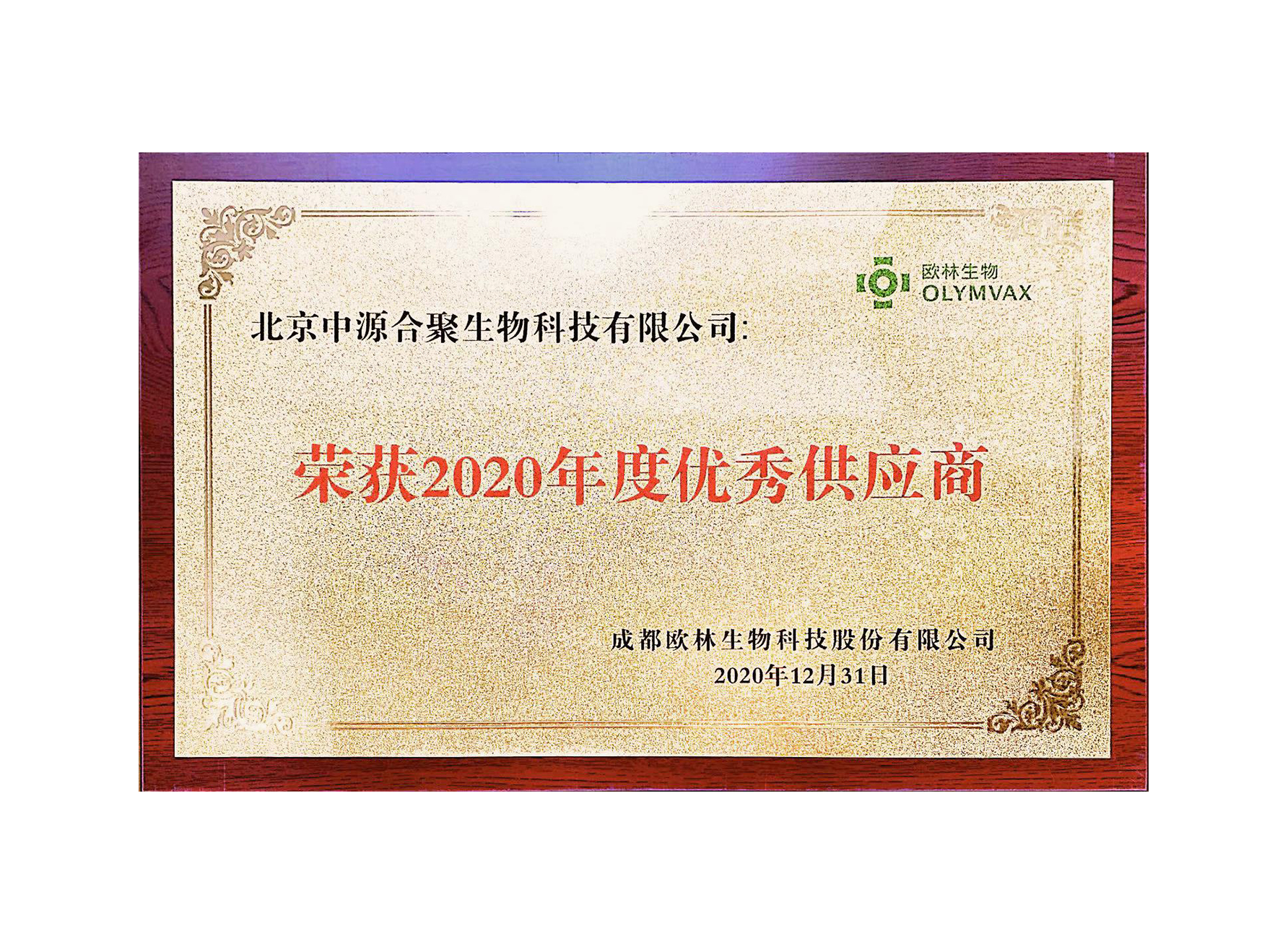 欧林生物“2020 年度优秀供应商”称号