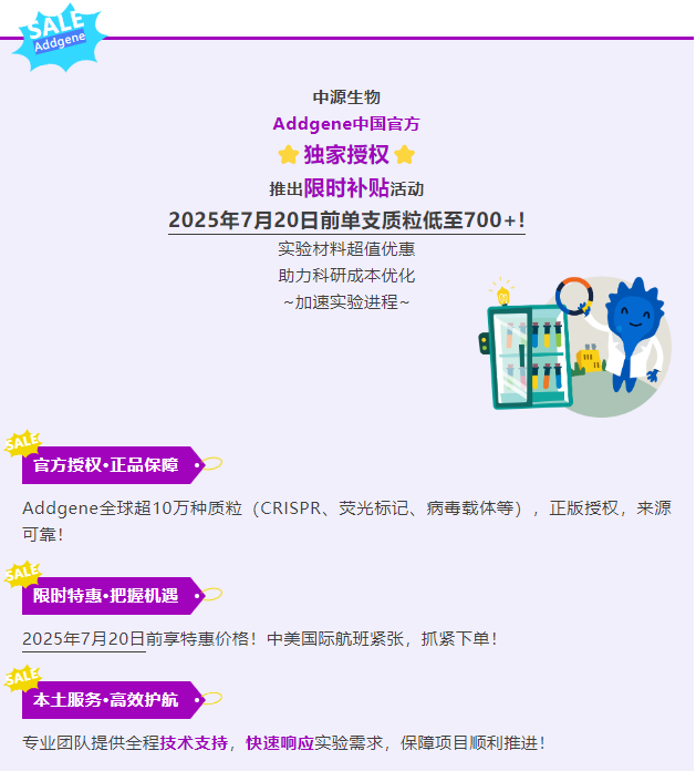 球友会平台 Addgene中国官方 ⭐独家授权⭐ 推出限时补贴活动 2025年7月20日前单支质粒低至700+!实验材料超值优惠 助力科研成本...2025-05-16 09:24:00.0