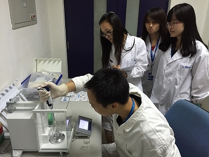 在比赛现场,为了让更多的老师和同学有机会参加比赛,今年准备了两台天平,而且是将移液器操作指导的专题培训和达人赛同时进行。博奥公司新入职的一些员工参加了Rainin工程师杜红主讲的关于如何正确的使用移液器的专题培训,现场演示并纠正了移液操作过程中的一些错误动作,到场的老师都表示非常的满意,为精准移液操作打下了实践基础。