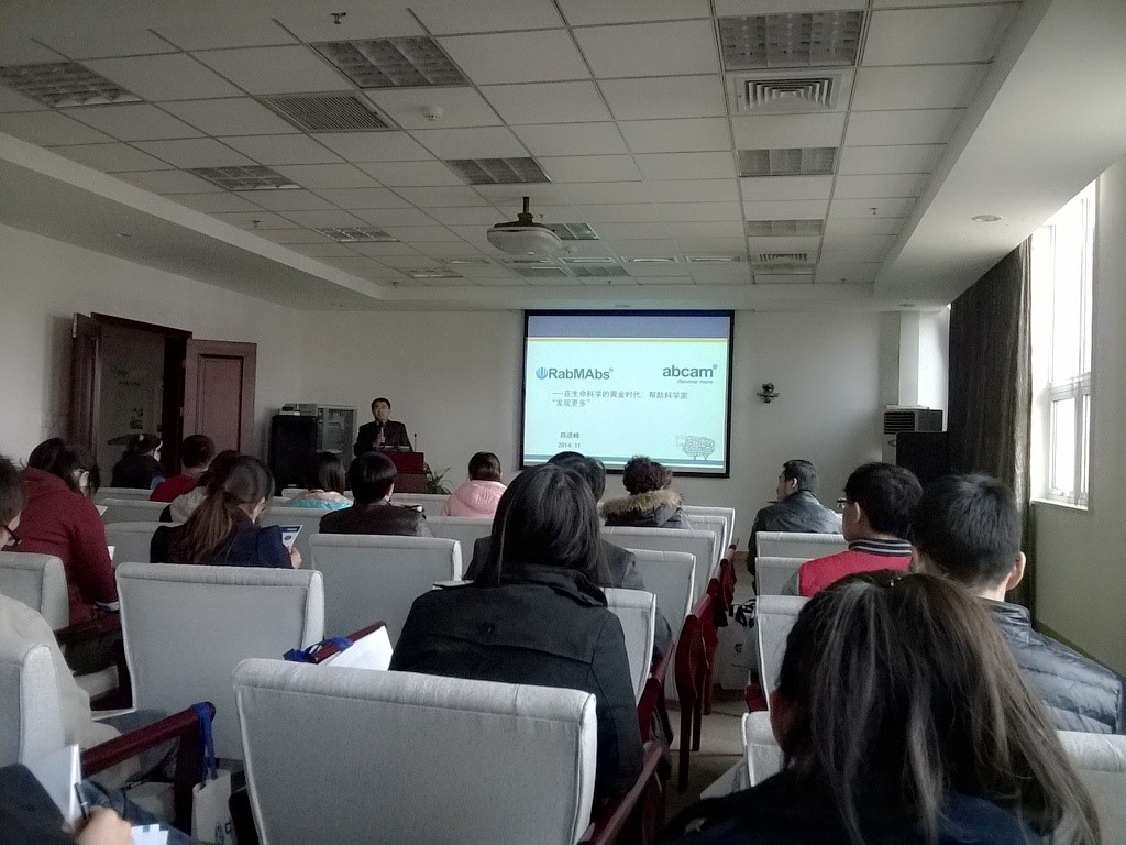 2014年11月7日,一年一度的“Abcam巡回讲座---天津站”来到天津国际生物医药联合研究院,Abcam与会专家路进峰、牛新乐,针对“兔单抗在免疫学实验中的优势”、“In-cell WB (Elisa)”及“细胞成像实验技巧”三个主题,与广大师生进行近距离的交流。