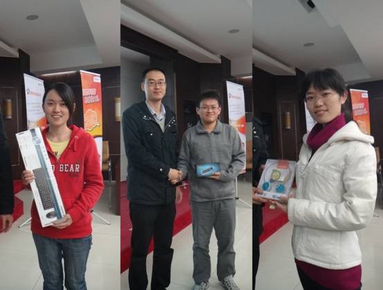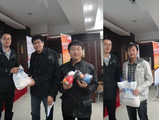 中原公司研究生交流论坛的一个重要环节,就是最激动人心的抽奖环节,除了每一位到场的老师和同学都能获得疯狂的小鸟一只外,球友会平台(中国)还现场抽取了3套疯狂小鸟公仔,迷你键鼠,无线音乐耳机和无线键鼠套装等共六个大奖,恭喜如下获得大奖的六位幸运儿: