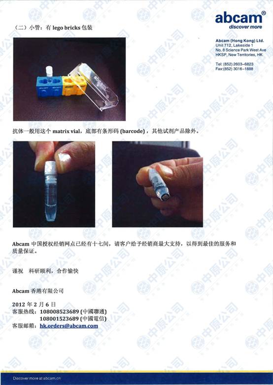 近期,Abcam公司收到一些水货及假货的投诉,这种产品,因进货渠道不明,运输条件不合规格,产品效用不明,从而导致一些实验做不出结果。在此,Abcam特此声明,这类产品一律没有产品保证,不退款或换货,请从正规渠道订购。