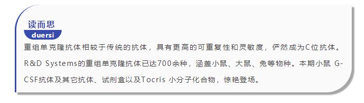 该产品建议用在需要抗体对的免疫分析实验中。若是单纯的 ELISA 检测,可选用 Mouse G-CSF DuoSet ELISA Kit (Catalog # DY414),DIY 你的专属 ELISA 试剂盒;或者选用完整的 Mouse G-CSF Quantikine ELISA Kit (Catalog # MCS00),省心高效。