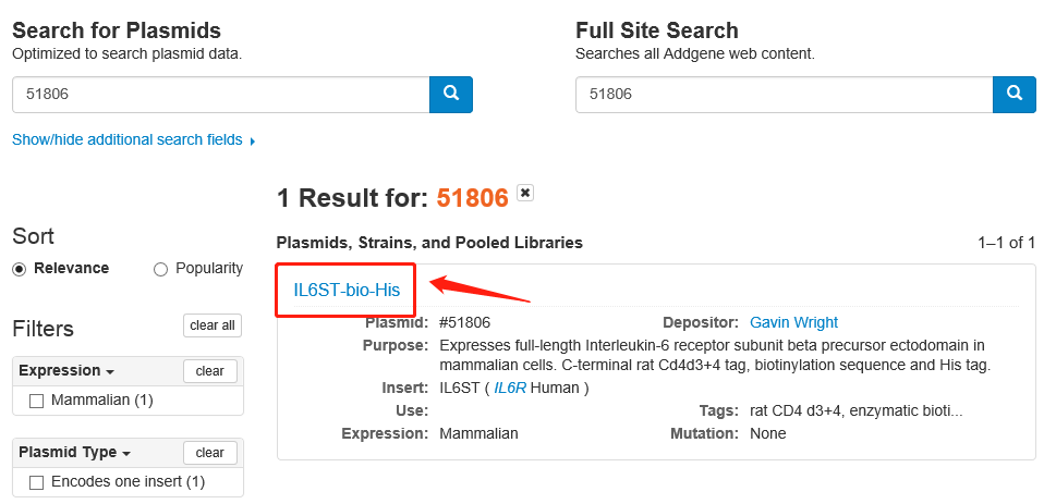 首先,在Addgene官网首页的搜索栏中输入质粒的编号:51806进行搜索,结果如下图所示,点击蓝色的质粒名称,进入相关质粒的具体页面。
