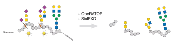 如何得知到底哪个位点发生了O-连接的糖基化呢?是否有一种酶能够切割糖基化位点所在的氨基酸,使得蛋白会被切成几段,这样以来通过质谱分析或者其他方法就能分析出糖基化发生的位点呢?答案Yes. 这款酶就是瑞典Genovis公司的OpeRATOR,该酶在唾液酸去除酶SialEXO的帮助下,可以切割O-糖基化位点所在氨基酸的N端,真正做到了哪里有糖切哪里!酶切示意图如下: