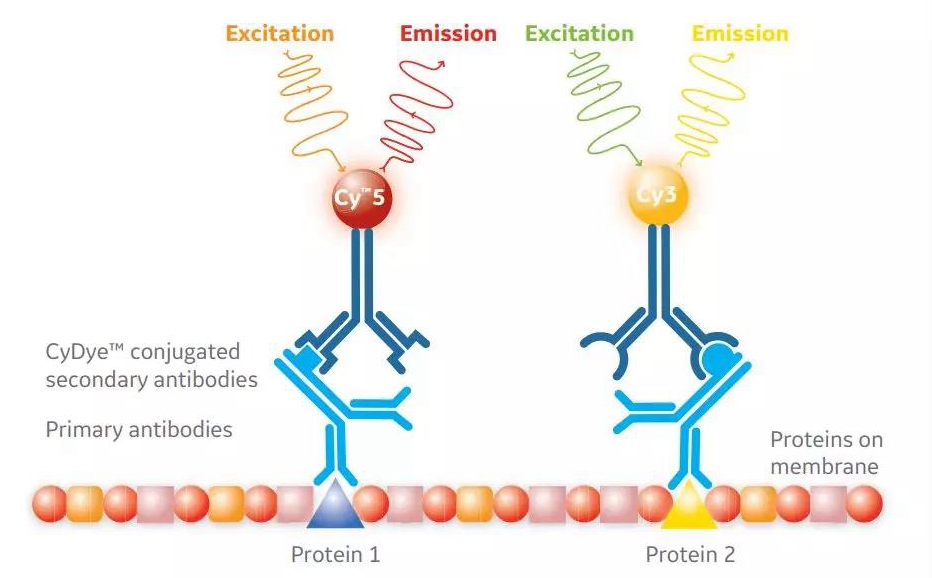 荧光二抗用起来就非常方便了,二抗上直接带标记,所以直接拿去曝光显色,一张膜可以同时杂两个抗体,不用为内参而裁膜的感觉真好。