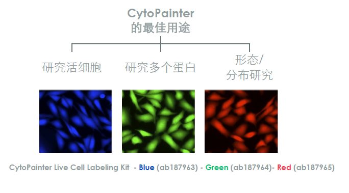 有两种不同的方法可用于确认蛋白在细胞中的定位:细胞器特异性的抗体和细胞器染料。细胞器染料(Abcam有Cytopainter系列染料)作为复染色可以帮助确定特异的蛋白或者您的靶标分子在细胞内的定位,而使用细胞器特异相关的蛋白抗体来进行成像,则有助于更好地理解靶标分子在细胞中的功能。