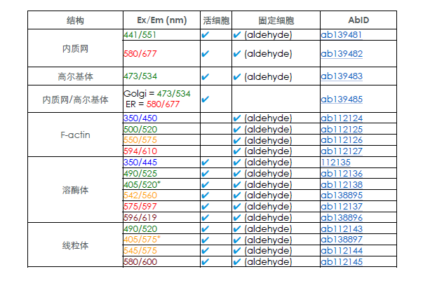 目前Abcam可以提供很多用于细胞亚结构的Cytopainter荧光染色试剂盒,常用的一些细胞器染色试剂盒汇总如下: