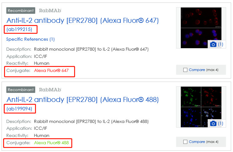 关于第2点,球友会平台(中国)举例进行说明。如下图所示,同一克隆号【EPR2780】的IL-2抗体偶联了不同的荧光素(AF647和AF488),其抗体货号不同,是2个不同的产品。