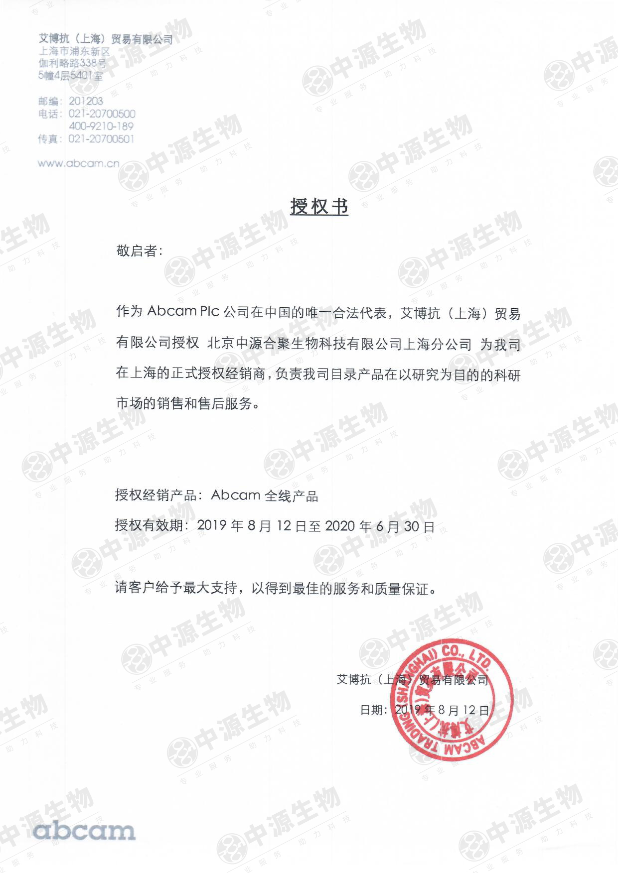 近年来,随着合作的不断加深,2019年8月起,球友会平台在原代理区域(北京、天津、内蒙古、青海、西藏、宁夏)的基础上新增了Abcam上海地区代理权,球友会平台(中国)将一直秉承“专业服务,助力科技”的宗旨,一如既往的为客户带来优质的产品和更好的服务。