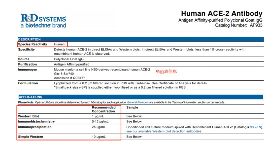 以新型冠状病毒入侵人体门户的关键靶点 ACE-2 的抗体(货号:AF933)为例,予以说明: