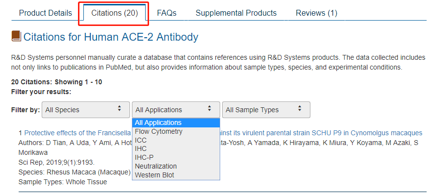 在找不到合适抗体的情况下,也可以参考「第一个吃螃蟹的人」的实验结果。查看网页上的引文「Citations」部分,即可了解其他研究人员是否已发布过你感兴趣的应用、样本类型或实验种属。