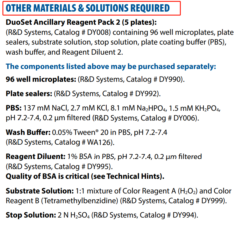 在说明书的「Other Materials & Solutions Required」部分,会提示需要搭配哪些试剂,产品页面也会给出建议搭配的附属试剂(请参考下图)。大部分 DuoSet® ELISA 试剂盒可以直接购买成套的辅助试剂盒,例如 DY007、DY008、DY009 等。