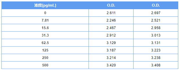 下表中显示,用户使用 cat# DY450:Mouse CCL3/MIP-1 alpha DuoSet ELISA 和自行组配的附属试剂,得到的标准品 OD 值(450 nm 的测定值减去 570 nm 的测定值)。可以看到,全部标准品 OD 值(包括未加标准品 0 值孔)均出现高的显色,无梯度。