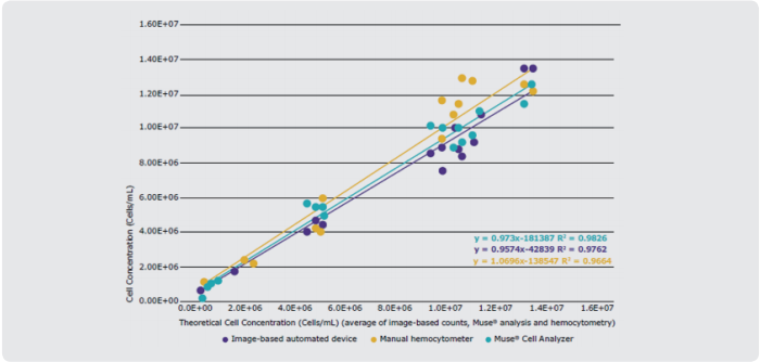 Muse®细胞分析仪计数结果比手工血球计数法或基于细胞成像的自动计数法更为准确。多种贴壁细胞和悬浮细胞(MCF-7, K562, HB, CHO-K1和Jurkat细胞系 ) 采用所示三种方法进行细胞计数。每种方法得到的数据均与理论值进行线性回归的曲线拟合。Muse®细胞分析仪得到的分析数据与理论细胞浓度关联性最好,其斜率非常接近1,从而验证了Muse®比其他两种计数方案结果更为精确。