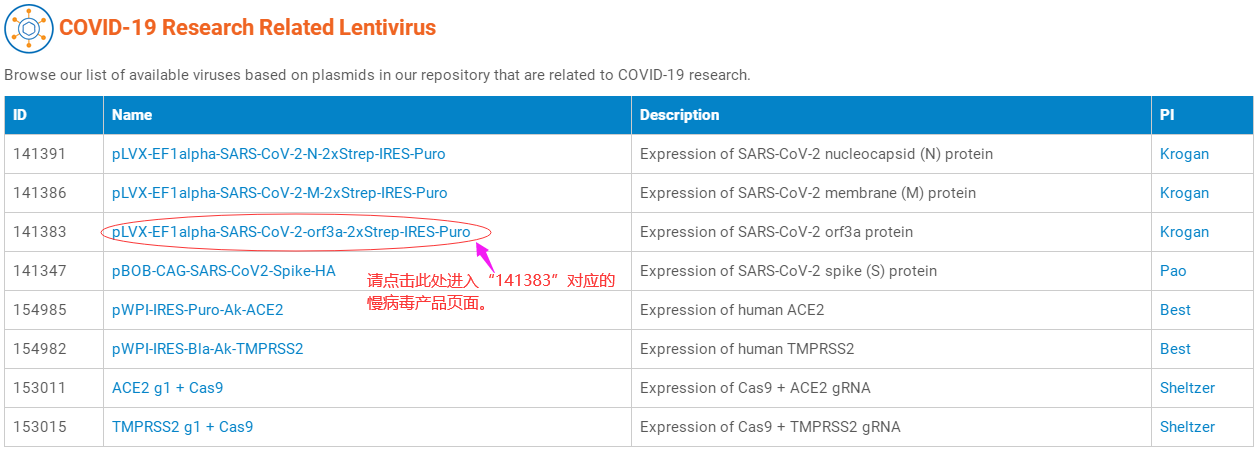 以下是目前可以提供的COVID-19研究相关慢病毒对应的质粒,点击“Name”列即可进入质粒对应的慢病毒产品页面,从而可以查询慢病毒产品的价格、体积、滴度、运输形式、储存温度等信息。