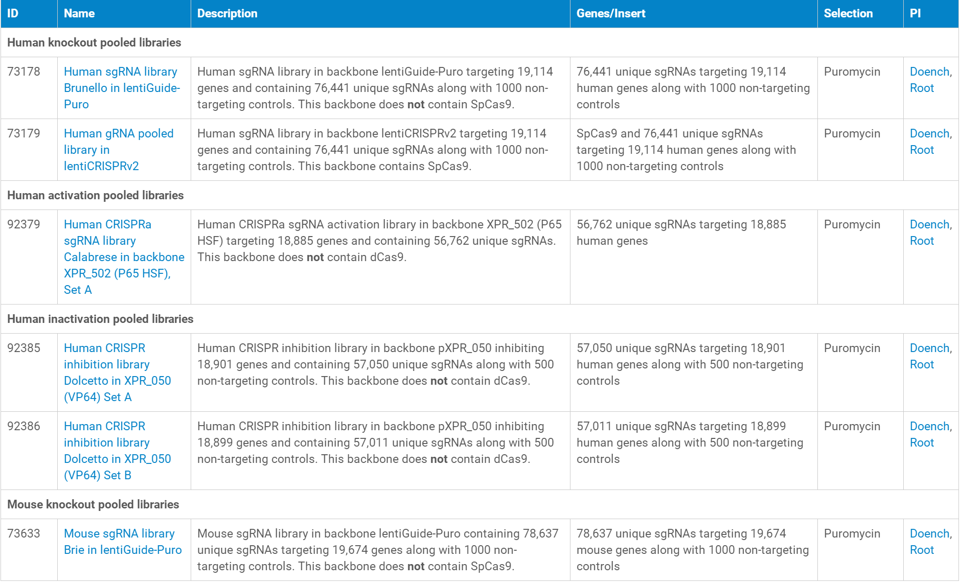 以下是目前可以提供的CRISPR libraries研究相关慢病毒对应的质粒,点击“Name”列即可进入质粒对应的慢病毒产品页面,从而可以查询慢病毒产品的价格、体积、滴度、运输形式、储存温度等信息。