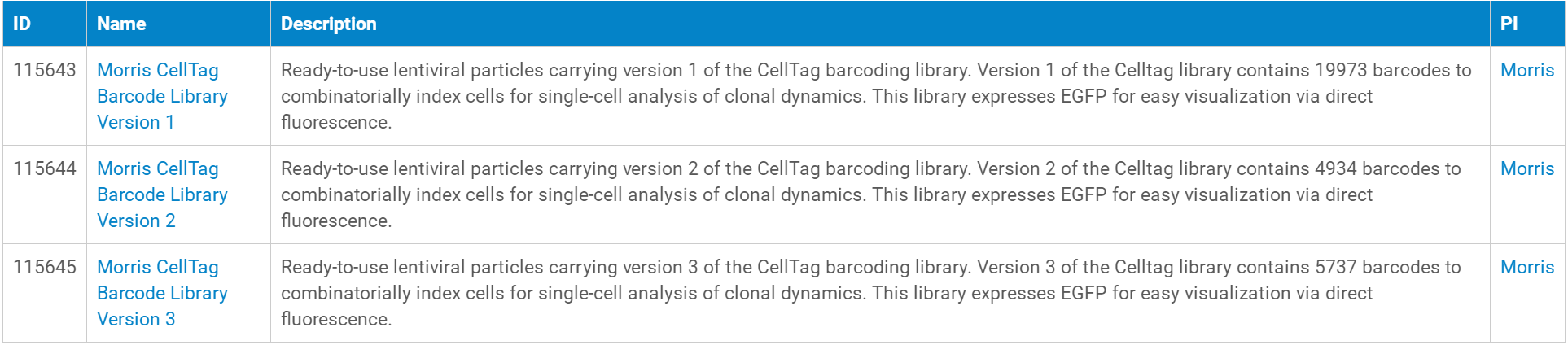 以下是目前可以提供的Barcoding Libraries研究相关慢病毒对应的质粒,点击“Name”列即可进入质粒对应的慢病毒产品页面,从而可以查询慢病毒产品的价格、体积、滴度、运输形式、储存温度等信息。