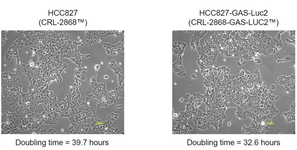 图3:光镜下亲代HCC827和HCC827-GAS-Luc2的细胞形态。将细胞保持在ATCC推荐的培养条件下,在显微镜下观察细胞形态,并用数码相机拍摄图像。