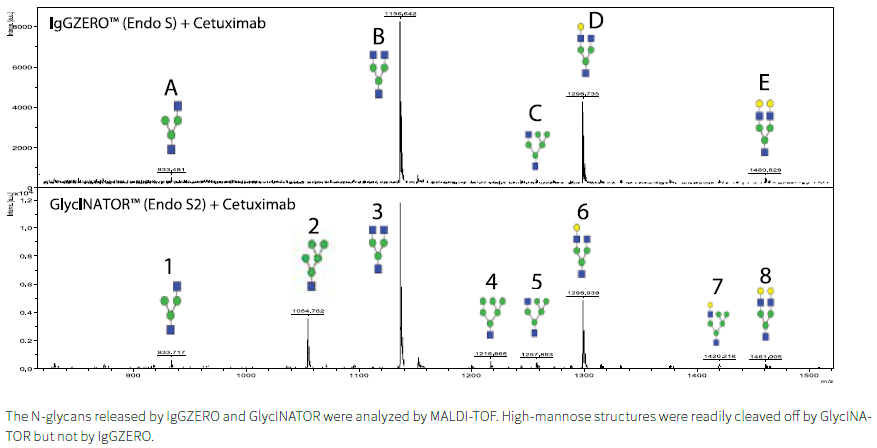 为了比较IgGZERO和GlycINATOR对N-聚糖的特异性,分别用这两种酶对西妥昔单抗进行去糖基化。抗体去糖基化后,用FabRIC ATOR水解为F(ab ’)2和Fc片段。西妥昔单抗含有高甘露糖型聚糖。