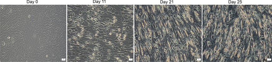 图4:hTERT白色前脂肪细胞在培养的第0-25天内不同时期下的分化形态的显微镜图像。