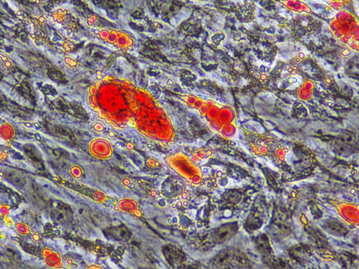 图3:h-TERT永生化白色前脂肪细胞(ATCC®CRL-4063™)分化的白色脂肪细胞,在20倍物镜下使用红色油性染料染色后的显微镜图像。