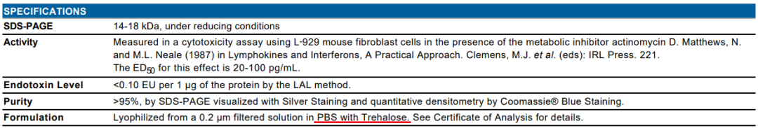 答案就在说明书 Formulation 那一栏里,球友会平台(中国)在蛋白中添加了海藻糖。海藻糖是一种以两个葡萄糖分子通过 α,α,1,1-糖苷键连接的二糖。海藻糖是一种非还原糖,不与氨基酸或蛋白质发生反应。