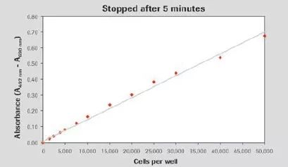 图1. Cytotoxicity Detection KitPLUS (LDH)具有良好的线性;图为使用该试剂盒测定不同数目U-937细胞培养基中总LDH活性,底物孵育5min后进行检测。